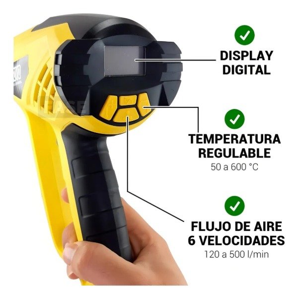 Con un rango de temperatura de 50 ºC a 600ºC y un flujo de aire ajustable en seis niveles, es ideal para remover pintura o activar materiales de plástico termoencogibles, entre otras aplicaciones.