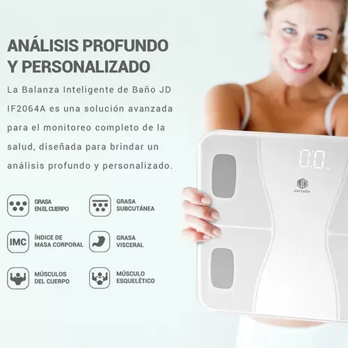 La Balanza Inteligente de Baño JD IF2064A es una solución avanzada para el monitoreo completo de la salud, diseñada para brindar un análisis profundo y personalizado. Con un diseño moderno y minimalista, esta balanza incorpora una amplia variedad de características que permiten seguir no solo el peso, sino una multitud de métricas que ofrecen una visión integral del estado físico de cada usuario.