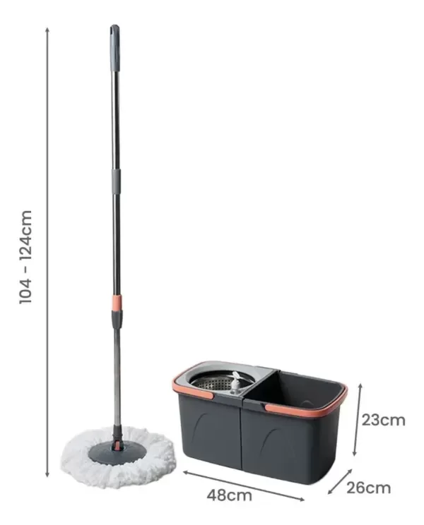 Material del mangoAcero inoxidableMaterial del trapoMicrofibraCon mango regulableSíLargo1,25 mCon cabezal giratorio del lampazo de limpiezaSíCon rotación de 360 gradosSíIncluye lampazo de repuestoSíIncluye balde centrifugadorSíMaterial del balde centrifugadorAcero inoxidablePisos recomendadosPlastificados, CerámicosCon lampazo lavableSí