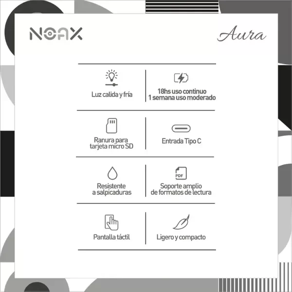 E-reader NOAX AURA 6 + Funda protectora Rigida - 100% ORIGINAL Contenido del paquete: 1X NOAX AURA 6" 1X Manual de usuario. 1X Cable USB-C 1X Funda protectora Rígida Especificaciones: Pantalla: 6” con 1024x758 PX. Memoria: 32 GB con espacio para miles de libros. Ampliable vía microSD (hasta 256 GB) Ram: 1GB Capacidad de la batería: 2200 mAh. Duración de la batería: Hasta 18 hs de uso continuo Conectividad: Wi-Fi o USB-C para carga y transferencia de archivos. Convierte texto escrito en sonido. Diccionario y traductor integrados. Con el diccionario instalado, leer en un idioma extranjero se convierte en un juego de niños. Formatos admitidos: AZW, DOC, FB2, HTML, DOCX, PDF, MOBI, PRC, EPUB, TXT, RTF, JPEG, PNG, BMP. Sistema operativo: Android 8.1 Permite activar retroiluminación en tonalidad fría y cálida. Dimensiones: 15x10.5x0.5 cm Peso: 185 gramos.