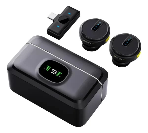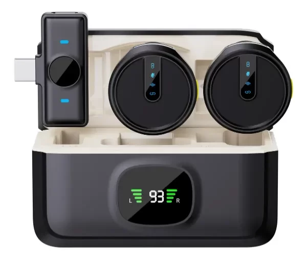 Micrófono Inalámbrico Profesional M34DC – Dual con Estuche de Carga y USB-C Micrófono ideal para creadores de contenido, entrevistas, clases online, cocina en vivo, YouTube, TikTok, vlogs y más. - Características principales - Transmisión inalámbrica 2.4GHz, estable y sin interferencias - Captación de voz en 360 grados con cancelación de ruido ambiental - Plug and Play, no requiere instalación ni aplicaciones - Pantalla LED en el estuche con indicador de carga para cada micrófono (L y R) - Luz LED en los micrófonos que indica encendido, carga y emparejamiento - Estuche con batería de 1000 mAh - Hasta 7 horas de uso continuo - Alcance de hasta 25 metros sin obstáculos Ficha técnica Frecuencia de respuesta: 20 Hz a 20 kHz Sensibilidad: 38 dB 3 dB Impedancia: menor a 2.2 Conectores: Entrada: USB tipo C Salidas: Adaptador Lightning y cable 3.5 mm TRS Capacidad de batería: Estuche: 1000 mAh Micrófonos: 100 mAh cada uno Tiempo de carga: 1 hora Latencia: menor o igual a 20 ms Protocolo inalámbrico: 2.4G privado Antena: cerámica Dimensiones (caja): 12.5 x 5.7 x 13 cm Peso total del paquete: 180 gramos Contenido del paquete 2 micrófonos transmisores 1 receptor USB tipo C 1 estuche de carga con pantalla LED 1 cable de carga USB-C 1 manual de usuario 1 caja de presentación