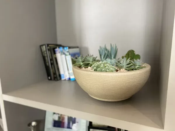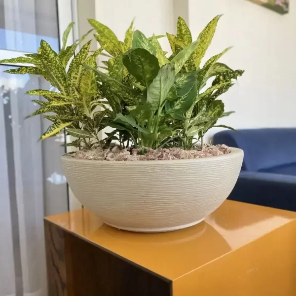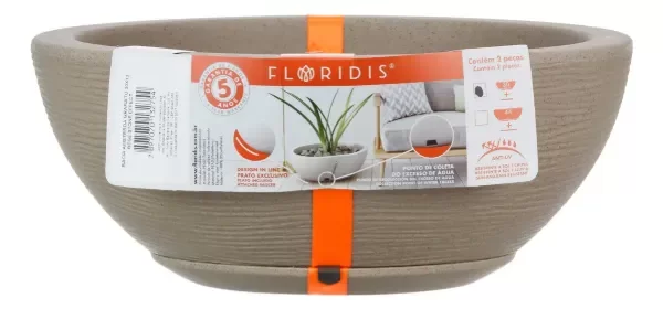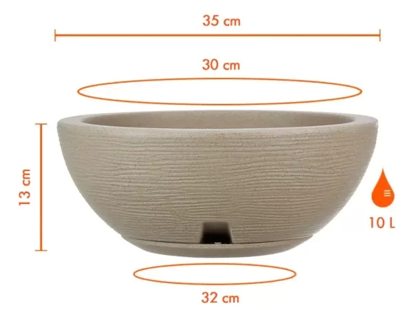 Ventajas - Incluye plato de recolección agua - Construido en polietileno, material altamente resistente a la presión e impacto - No genera residuos peligrosos en su fabricación y es de bajo impacto ambiental - Apto para intemperie, resistente al agua, humedad y rayos UV - No se reseca - Simple de limpiar - Resistente a químicos - Alta durabilidad - 100% Reciclable: No hay mezcla de materiales en la fabricación Altura: 13 cm Diámetro de la boca: 30 cm Diámetro de la base: 32 cm Ancho exterior: 35 cm Capacidad: 10 L Peso: 0,5 kg NOTA: el color y brillo del producto puede tener una mínima diferencia por la luz que proyectamos al momento de realizar las fotos.