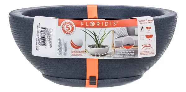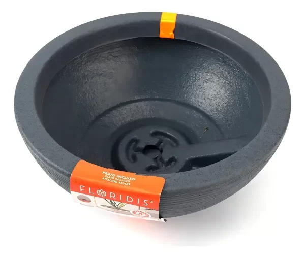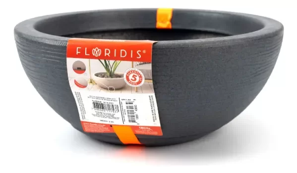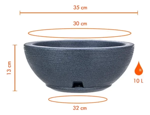 Ventajas: - Incluye plato de recolección agua - Construido en polietileno, material altamente resistente a la presión e impacto - No genera residuos peligrosos en su fabricación y es de bajo impacto ambiental - Apto para intemperie, resistente al agua, humedad y rayos UV - No se reseca - Simple de limpiar - Resistente a químicos - Alta durabilidad - 100% Reciclable: No hay mezcla de materiales en la fabricación Altura: 13 cm Diámetro de la boca: 30 cm Diámetro de la base: 32 cm Ancho exterior: 35 cm Capacidad: 10 L Peso: 0,5 kg NOTA: el color y brillo del producto puede tener una mínima diferencia por la luz que proyectamos al momento de realizar las fotos. ** No incluye planta **