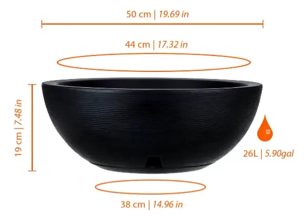 Ventajas: - Incluye plato de recolección agua - Construido en polietileno, material altamente resistente a la presión e impacto - No genera residuos peligrosos en su fabricación y es de bajo impacto ambiental - Apto para intemperie, resistente al agua, humedad y rayos UV - No se reseca - Simple de limpiar - Resistente a químicos - Alta durabilidad - 100% Reciclable: No hay mezcla de materiales en la fabricación Altura: 19 cm Diámetro de la boca: 44 cm Diámetro de la base: 38 cm Ancho exterior: 50 cm Capacidad: 26 L Peso: 1,1 kg NOTA: el color y brillo del producto puede tener una mínima diferencia por la luz que proyectamos al momento de realizar las fotos. ** No incluye planta **