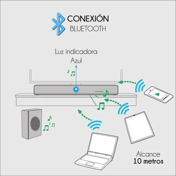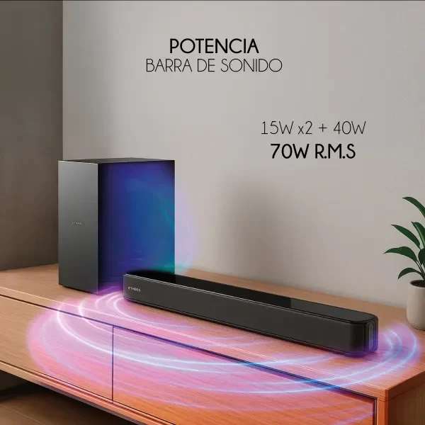 Configuración de canales2.1Potencia RMS70 WCantidad de parlantes3Parlantes incluidosBarra de Sonido y SubwooferConectividadAux, Bluetooth, Entrada para audio óptico, USB, entrada TVCon reproductorNo