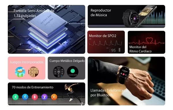 Recordatorios, Recordatorio anti sedentarismo, Cronómetro, Linterna, Encuentra mi smartwatch, Calculadora, Control de ciclo menstrual, Asistente virtual, Medidor de presión arterial, Alarma, Gestión de mensajes, Notificaciones, Control de música, Clima, Monitor de sueño, Medidor de frecuencia cardíaca, Medidor de oxígeno, Gestión de llamadas, Consumo de calorías, Cuenta pasos, Distancia recorrida, Aplicación deportiva, Relajación