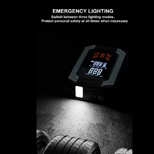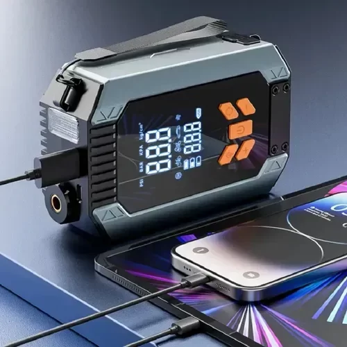 El equipo ST9632 es la herramienta ideal para quienes quieren estar preparados ante imprevistos: combina arrancador de batería, compresor de aire, power-bank y luz de emergencia en un solo dispositivo compacto.