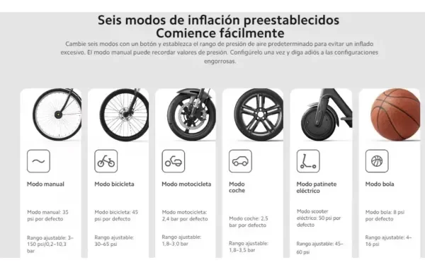 Seis modos de inflación preestablecidos: Modo bicicleta, Modo Manual, Modo motocicleta, Modo coche, Modo patín eléctrico y Modo pelota. Cambie seis modos con un botón y establezca el rango de presión de aire predeterminado para evitar un inflado excesivo. El modo manual puede recordar valores de presión. Configúrelo una vez y diga adiós a las configuraciones engorrosas.