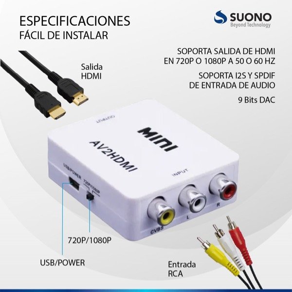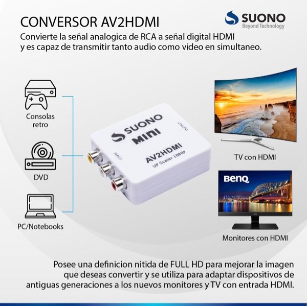 El conversor AV2HDMI convierte la señal analogica de RCA a señal digital HDMI y es capaz de transmitir tanto audio como video en simultaneo, posee una definicion nitida de FULL HD para mejorar la imagen que deseas convertir y se utiliza para adaptar dispositivos de antiguas generaciones a los nuevos monitores y TV con entrada HDMI